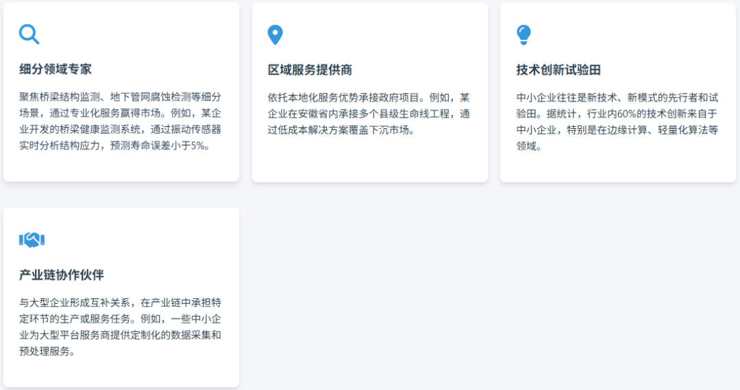 - 聚焦桥梁应力监测、地下管网腐蚀检测等细分场景,如某企业研发的桥梁应力监测系统,寿命预测误差<5%,形成技术壁垒;依托本地化服务优势,拓展县域及下沉市场(如安徽县域生命线项目,单项目造价控制在 500 万元内,适配地方预算)。